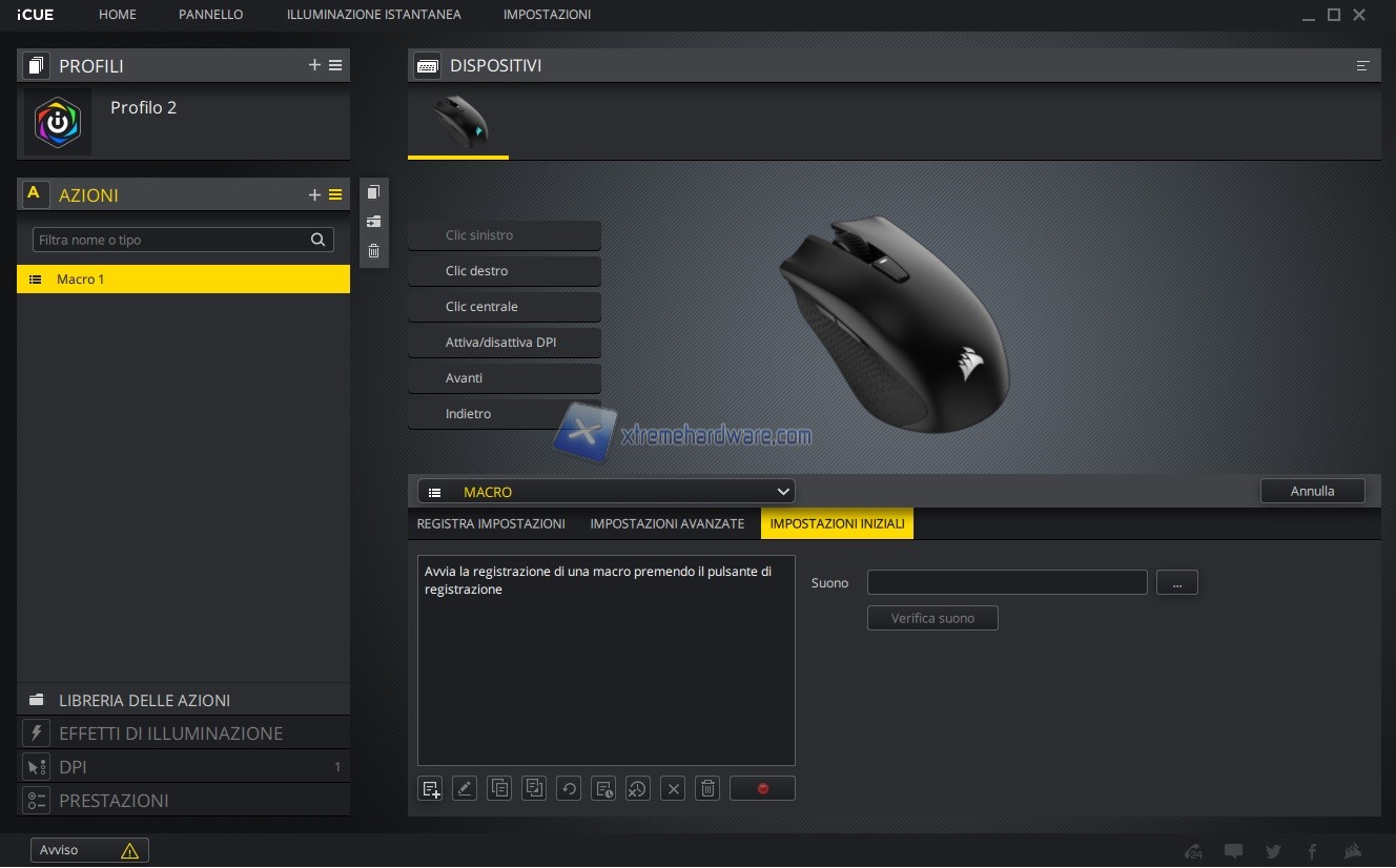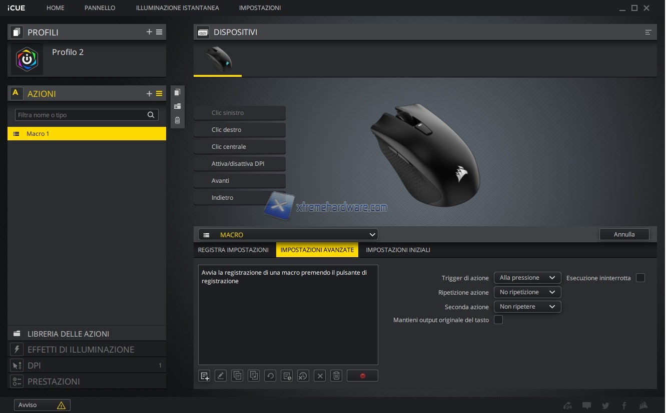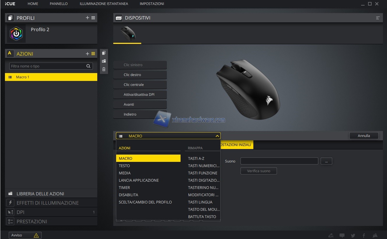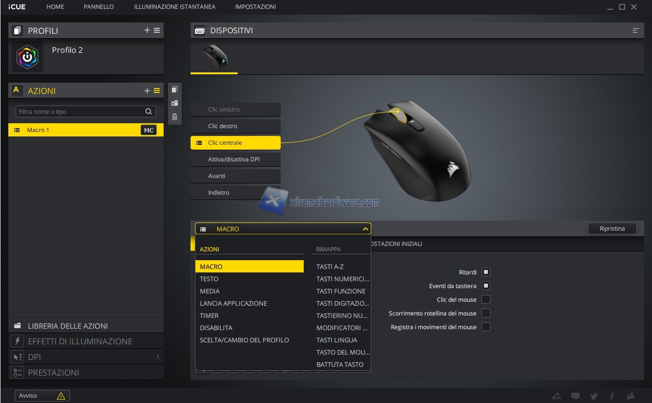 A seguire dal Menu ‘’Azioni’’ potremo gestire la personalizzazione e remap dei tasti presenti sul mouse o alla creazione di Macro tramite il relativo editor.