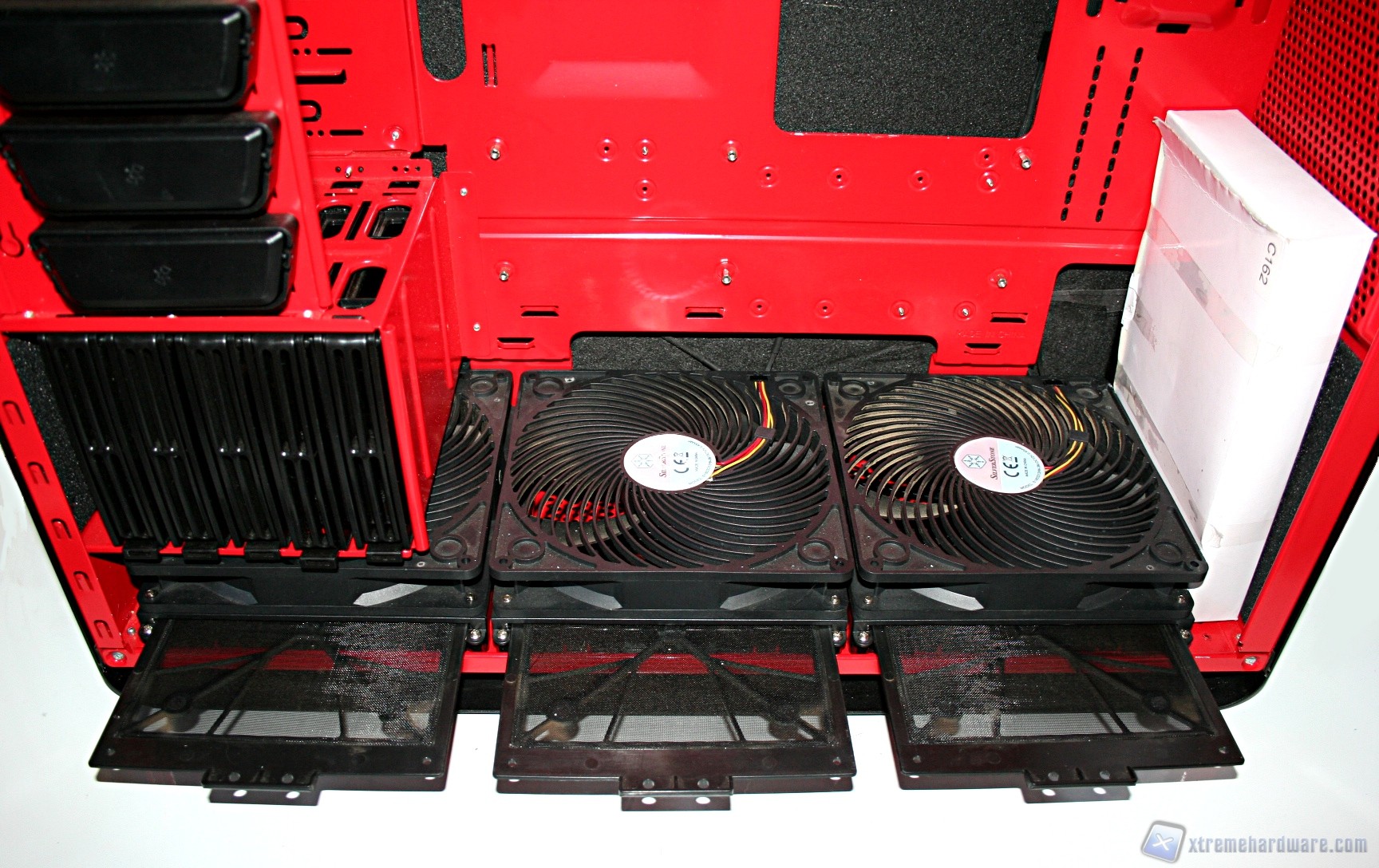 Nella parte superiore non è possibile l’intallazione di radiatori sullo stile Corsair H100 in quanto c’è spazio a sufficienza solo per una singola ventola da 120mm; al contrario quindi possono essere montati modelli del tipo antec 920. E’ presente uno spessore particolarmente elevato, che permetterà l’installazione di modelli a liquido particolarmente spessi ed ingombranti, anche a doppia ventola. Alternativamente è possibile integrare nella parte inferiore un sistema a liquido, e quindi un radiatore triventola, da posizionare al posto delle due AP181 oppure sopra di esse. Come abbiamo già detto precedentemente, è presente la moderna apertura posteriore, per il cambio del dissipatore e del backplate, qualora necessario.